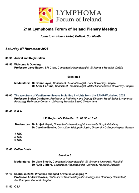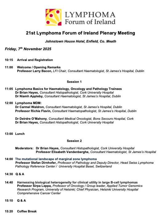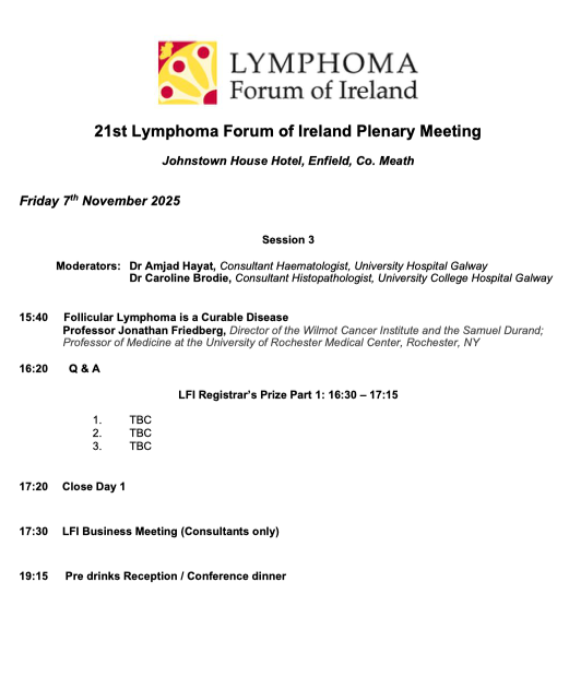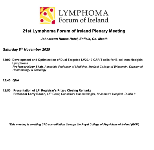 Agenda and Speakers confirmed for the 21st Lymphoma Forum of Ireland Plenary Meeting